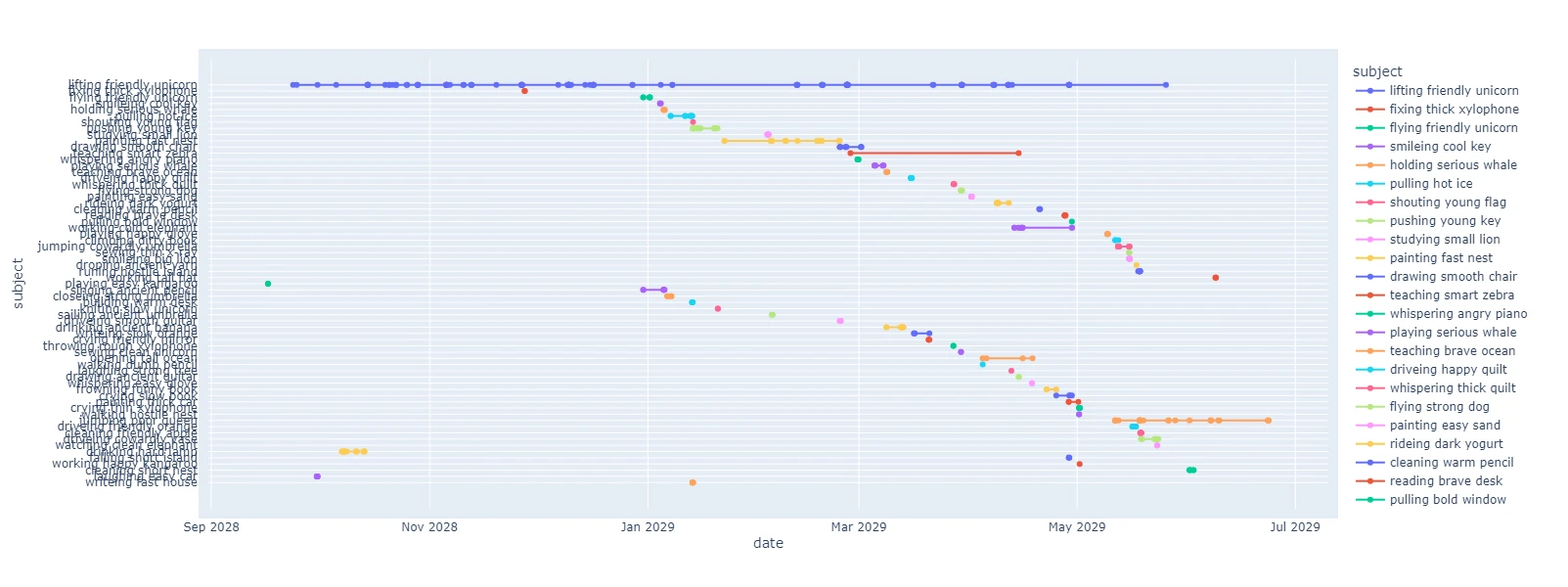 With respect to correlating all messages in their respective chains, this is the most crucial part of all our preprocessing. In the end, all that matters is that related messages all wind up with some reliably correlating field to use in our plots (below). With this cleanup pass, the subject line is now that correlating field.